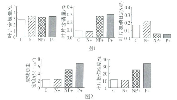 (2)①由图1中数据可知,与对照组相比,施氮肥组叶片含氮量及N/P变化不大,而施磷肥及同时施氮肥和磷肥组的叶片含磷量显著提高,N/P明显下降,说明被入侵草原土壤中主要缺磷元素。②由图2中数据可知,高羊茅叶片上虎蛾幼虫密度越大,对叶片的啃食程度越大。