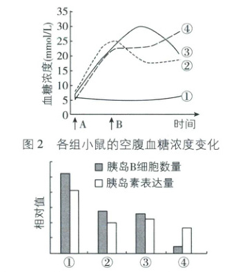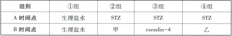 (2 分)。(4) 为进一步探究司美格鲁肽的降血糖机制, 现将生理状态相似的小鼠随机均分成 4 组, 在 A、B 时间点, 注射 4 种实验试剂: STZ( 能特异性诱导胰岛 B 细胞凋亡)、exendin-4( 一种降血糖药物)、司美格鲁肽、生理盐水, 具体见表。在相同条件下培养小鼠, 期间持续检测小鼠空腹血糖浓度, 结果如图 2 所示。