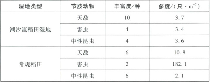 中保存、固定。②与潮汐流稻田湿地相比, 常规稻田中害虫丰富度和多度分别表现为