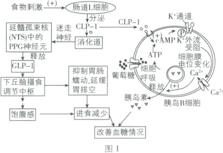 司美格鲁肽被誉为高血糖肥胖症的 “减肥神药”, 其有效成分为胰高血糖素样肽 -1 ( GLP-1) 类似物, 人体内 GLP-1 部分作用机制如图 1 所示。请回答下列问题: