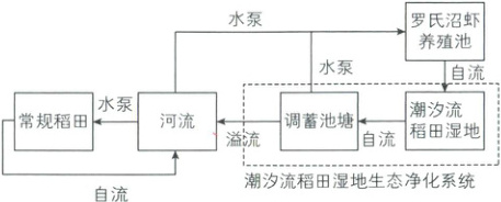 罗氏沼虾属于杂食性动物, 以植物、底栖动物和腐殖质为食, 具有较强的适应能力, 但集约化养殖因投放饵料易造成水体富营养化。为此, 科研人员设计了潮汐流稻田湿地生态净化系统用于处理罗氏沼虾养殖尾水, 主要过程如图。请回答下列问题: