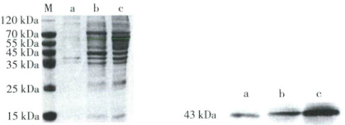 (5)对PtsS蛋白在鸡毒支原体体内的分布进行定位分析时,对鸡毒支原体膜蛋白(a)、胞浆蛋白(b)和总蛋白(c)进行电泳,结果如下图。得出的结论是