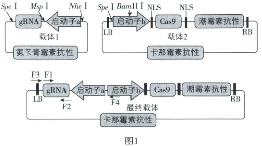 。最终载体中gRNA基因还可能位于启动子a、b之间,选用图1中F1、F4