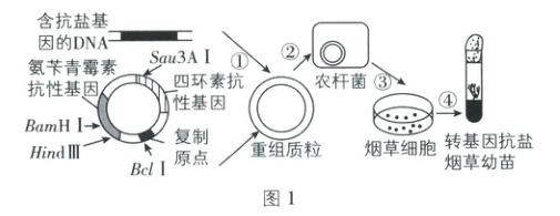 处理农杆菌以便将重组质粒导入农杆菌细胞。(5)在将转入抗盐基因的烟草细胞培育成完整植株的固体培养基中,除营养物质外还必须添加