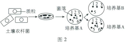 (6)基因工程中的检测筛选是一个重要的步骤。为筛选出导入了重组质粒的农杆菌,图 2 表示运用影印培养法(使一系列培养皿的相同位置上能出现相同菌落的一种接种培养方法)检测基因表达载体是否导入了农杆菌。培养基中除了含有细菌生长繁殖必需的成分外,培养基 B 还含有