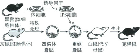 13. 我国科学家利用体细胞诱导产生多能干细胞(iPS细胞),并将其注射到无法发育成成体阶段的四倍体囊胚中,最终获得克隆鼠,经鉴定证实克隆鼠确实从iPS细胞发育而来,并可繁殖后代。实验流程见图,下列叙述错误的是