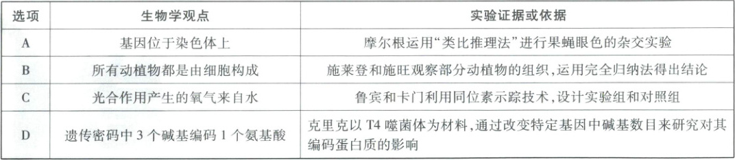 [深度解析]摩尔根运用假说—演绎法进行果蝇眼色的杂交实验,A错误;施莱登和施旺观察部分动植物的组织,运用不完全归纳法得出“所有动植物都是由细胞构成”的结论,B错误;鲁宾和卡门利用同位素示踪技术,设计的实验为相互对照实验,C错误;克里克以T4噬菌体为材料,研究其中某个基因的碱基增加或减少对其所编码蛋白质的影响,用实验证明遗传密码中3个碱基编码1个氨基酸,D正确。