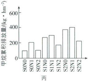 。(3)水稻生长过程中土壤微生物会释放多种温室气体,如$CH_4$、$N_2O$等。甲烷杆菌在厌氧环境下分解有机物产生$CH_4$,甲烷氧化菌是需氧型细菌,可分解$CH_4$。进一步研究表明,秸秆还田、氮肥施用对稻田$CH_4$的排放也有较大影响(如图丙),其中N0、N1、N2三组的氮肥施用量分别为$0\ kg· hm^{-2}$、$180\ kg· hm^{-2}$、$360\ kg· hm^{-2}$。