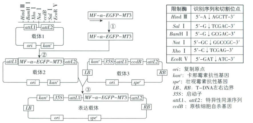 24. (11分)金属硫蛋白(MT3)富含巯基,对金属离子具有强亲和力,降低重金属的毒性,减少对植物的伤害。信号肽($MF-\alpha$)能介导重组融合蛋白分泌到细胞外。研究人员合成$MF-\alpha-EGFP-MT3$融合基因,构建表达载体转化烟草,研究分泌型MT3对植物的影响。如图是表达载体的构建过程,请回答下列问题。