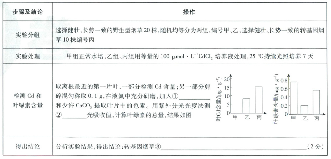 (4)①因为光合色素可溶于有机溶剂,所以提取光合色素时,需要加入无水乙醇。②因为类胡萝卜素主要吸收蓝紫光,叶绿素主要吸收红光和蓝紫光,所以用紫外分光光度法测红光吸收值,计算叶绿素的含量。③分析实验结果,丙组叶Cd含量明显高于乙组,且丙组叶绿素含量高于乙组、低于甲组,可得出结论:转基因烟草能富集Cd,降低Cd的毒害作用。
