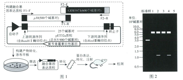 (3)由图2可知,酶切后电泳,1、2、3、4菌落都有长度约为5900 个碱基对的DNA片段,说明都含有质粒,只有2号和4号菌落还含有长度约为1100个碱基对的DNA片段,而融合基因含有1100碱基对,故可判断2号和4号菌落含有构建成功的融合基因表达质粒;因为2和4中只有两个条带,分别是融合基因和质粒DNA,故可判断p30和CRM197A基因中不含BamHI、HindIIII酶切位点,否则会出现多于2个的条带。
