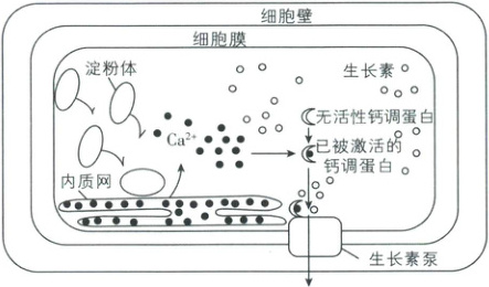 [深度解析]由图可知,在重力的影响下,淀粉体沿着重力方向沉降到内质网上,从而诱发Ca2+释放,Ca2+可作为一种信号分子,激活钙调蛋白,参与调节生长素的运输过程,A正确;生长素泵可将生长素沿重力方向运出细胞,从而使生长素沿重力方向积累,越靠近地面的细胞,所积累的生长素越多,根对生长素比较敏感,所以近地侧根细胞因为积累了较多生长素会抑制生长(常考点:根的向地性和茎的背地性),B错误;钙调蛋白被激活后会促使生长素泵将生长素沿重力方向运出细胞,从而导致近地侧根细胞积累较多的生长素而抑制生长,远地侧细胞所含生长素较少而促进生长,所以使根向地生长,故若施用钙调蛋白抑制剂,根可能没有向地生长的现象,C正确;重力是调节植物生长发育和形态建成的重要环境因素,D正确。