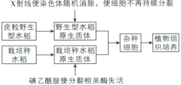 [深度解析]制备原生质体前需将两亲本的外植体消毒,以防止杂菌污染,常用的消毒剂有酒精、次氯酸钠等,无菌水只能起到清洗的作用,不能消毒,A错误;获取原生质体时在略高于细胞液浓度的缓冲液中操作,这样可以防止原生质体因吸水过多而涨破,B正确;经题图方法处理后,野生型水稻的染色体随机消失,而栽培种水稻原生质体的分裂相关酶失活,故一般情况下,只有不同来源的原生质体融合成的杂种细胞才能继续分裂,C正确;由于野生型水稻的染色体随机消除,杂种细胞获得供体遗传物质是随机的,所以需要通过抗病接种来筛选出具有抗病性的目标植株,D正确。