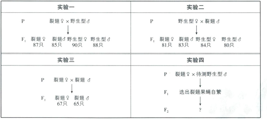 (1)实验一和实验二是正反交实验,且正反交的结果一致,说明裂翅突变是发生于常染色体上的突变。假设裂翅突变是隐性突变,相关基因用a表示,则实验一中亲本的基因型分别是aa和++,则子一代的基因型是+a,表型是野生型,与实验结果不符,说明假设错误,则裂翅突变是显性突变,相关基因用A表示。
