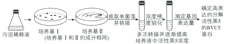 [深度解析]假单胞杆菌是细菌,抗生素能抑制细菌的生长和繁殖(关键点:抗生素可以抑制细菌的生长和繁殖,干扰素可以抑制病毒的增殖),故培养基I中不能添加抗生素,A错误;据图可知,培养基I和培养基II的成分相同,而将细菌从培养基I转移到培养基II的目的是进一步分离纯化细菌,B正确;高浓度的活性黑5是为了筛选出分解活性黑5能力强的假单胞杆菌,C错误;据图可知,驯化后的假单胞杆菌增强了BVU5基因的转录和翻译过程,D错误。