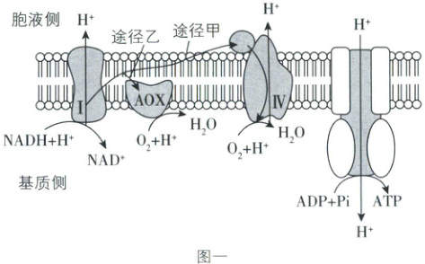 20. (12 分)图一表示拟南芥生物膜上发生的某生理过程。NADH 被复合体Ⅰ氧化后产生的电子经过一系列复合体传递给复合体Ⅳ最终将 $O_2$ 还原(途径甲),该生物膜上还存在交替氧化酶(AOX),该酶能直接利用复合体Ⅰ传递的电子催化 $O_2$ 的还原(途径乙),这对拟南芥抵抗强光、干旱等逆境具有重要意义。请回答下列问题。