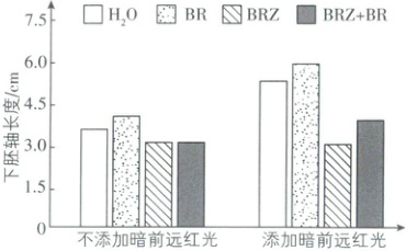 单独施加油菜素内酯抑制剂(BRZ),添加暗前远红光组和不添加暗前远红光组下胚轴长度一致,说明暗前远红光处理对南瓜苗下胚轴生长的影响与BR有关。同样添加暗前远红光,施加BR组比施加BR+BRZ组的下胚轴长度要长,说明细胞核内的基因表达受到BR的影响。同样用水处理,添加暗前远红光组下胚轴长度长于不添加暗前远红光组,说明细胞核内基因表达受到暗前远红光影响,C正确。