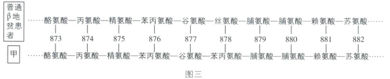 。(4) 科研人员还测定了普通 β 地贫患者及甲的$DNMT$蛋白异常部分氨基酸序列,结果如图三。