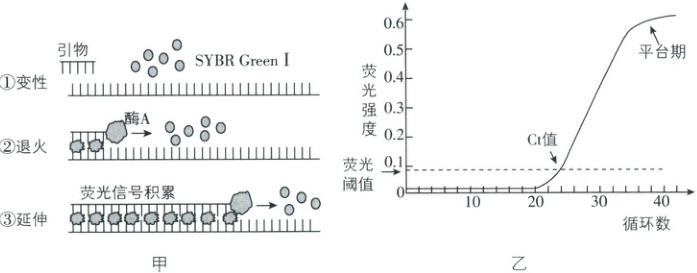 酶催化子链的合成。(3) 科研人员通过实时荧光 RT-PCR 检测病毒 RNA 时,荧光强度的变化如图乙所示。