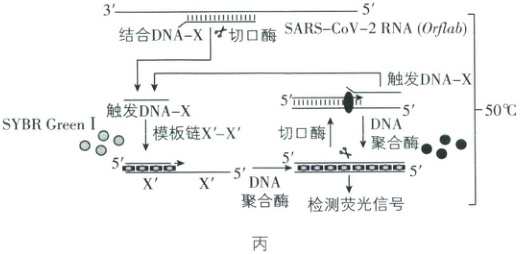 (4) 科研人员又发明了一种无逆转录—指数扩增反应技术(RTF-EXPAR),该技术可在 10 分钟内准确检测到低浓度 SARS-Cov-2 病毒 RNA,反应机理如图丙所示。研究人员设计的“结合 DNA-X”含有切口酶识别位点以及与病毒基因组的保守基因$Orflab$的互补序列。若样本中存在该病毒,在切口酶的作用下生成的“触发 DNA-X”可与两个重复序列($X'$和$X'$)结合,该重复序列以切口酶识别序列分隔。