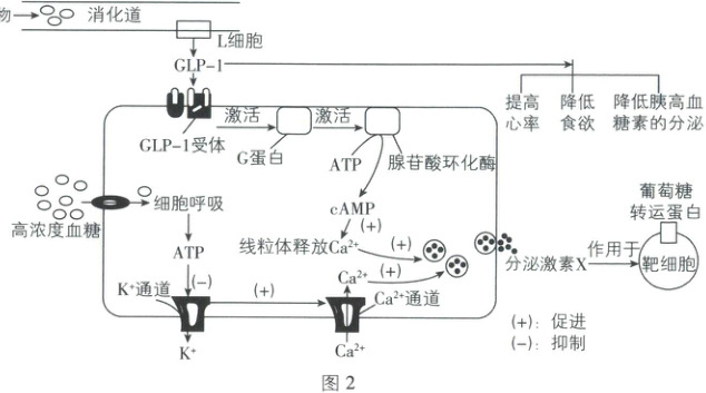 。(2) 司美格鲁肽的适应证是治疗糖尿病,其与体内 GLP - 1 结构类似(GLP - 1 作用机理见图 2)。经研究,司美格鲁肽也可作为“减肥药”。图中激素 X 是