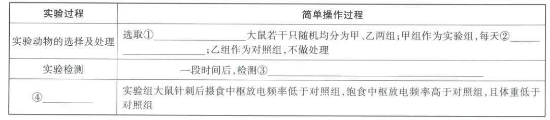 (4) 科研人员探究针刺穴位对肥胖者下丘脑食欲中枢的影响,发现连续一段时间每天针刺“足三里”“内庭”两穴适当时间,能抑制摄食中枢的兴奋性和提高饱食中枢的兴奋性,从而使肥胖者体重减轻。请完善下表并开展实验。