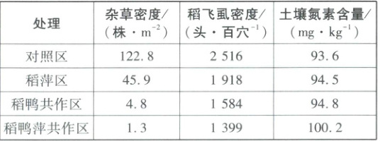 8. 稻鸭萍共作是一种生态农业的种植模式。为了进一步研究稻鸭共作的主要生态功能,试验设置了对照区、稻萍区、稻鸭共作区和稻鸭萍共作区共 4 个处理,研究结果如表,相关叙述正确的是