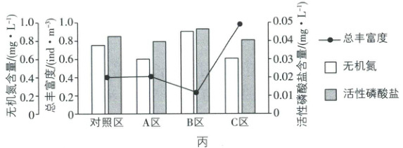 (4) 为研究海洋牧场的建立对海洋环境的影响,科研人员调查了对照区和牧场中 A、B、C 区中浮游动物的总丰富度(与环境的优劣呈正相关)及海水中无机氮、活性磷酸盐含量(与海水富营养化程度呈正相关),结果如图丙。