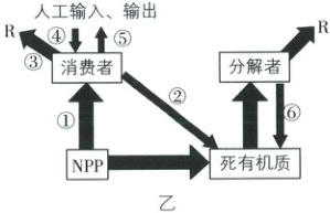 (2 分)。(3) 图乙为投放人工鱼礁后海洋牧场能量流动的模式图。图中 NPP 中的能量是指