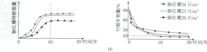 (2)分析题意可知,当模型中任何一个种群低于原始生物量的10%时,被认为此时的脉红螺密度超出环境容纳量;由图甲可知,当脉红螺种群增殖后密度为24只/m²时,竹蛏种群数在1年左右开始低于原始生物量10%,而脉红螺密度为23只/m²时竹蛏种群数量未低于10%,故每平方米脉红螺的环境容纳量是23只。模拟数据的前5年间,脉红螺种群数量在增加,增长率变化趋势均为下降。据图甲分析,10年内脉红螺种群密度在增大而竹蛏生物量在减少,原因是脉红螺竞争能力强,种群数量增加,导致竹蛏生物量减少。