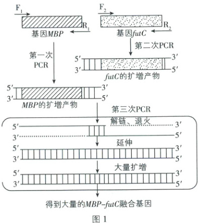 。(2) 利用重叠 PCR 的方法构建 MBP - futC 融合基因,如图 1。已知引物 F₂的 5′端不能与基因 futC 模板链配对的碱基为 5′ - CTTCTACAG - 3′,写出引物 R₁的 5′端前 6 个碱基序列:5′ -