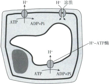 2. 植物细胞的细胞膜、液泡膜上含有 $ H^+- ATP$ 酶,可以转运 $ H^+$,有利于细胞对细胞外溶质分子的吸收和维持液泡内的酸性环境。分析下图,下列叙述正确的是