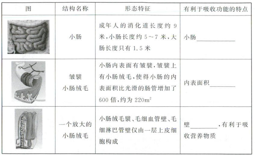 (2)阅读下表中图及相关资料,讨论小肠的结构与其吸收功能相适应的特点。
