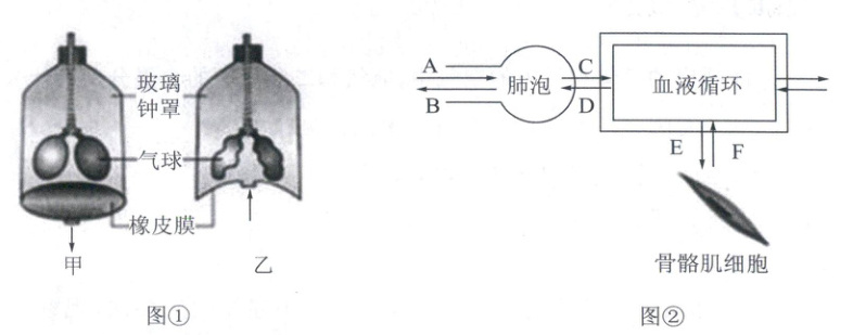 9. 国家一直倡导“有氧运动,科学健身”。在有氧运动时,人的呼吸、循环等系统协调配合,共同为骨骼肌生命活动提供物质和能量。图①是某同学制作的呼吸过程示意模型,图②所示为人体部分物质的获取和排出途径。请据图回答: