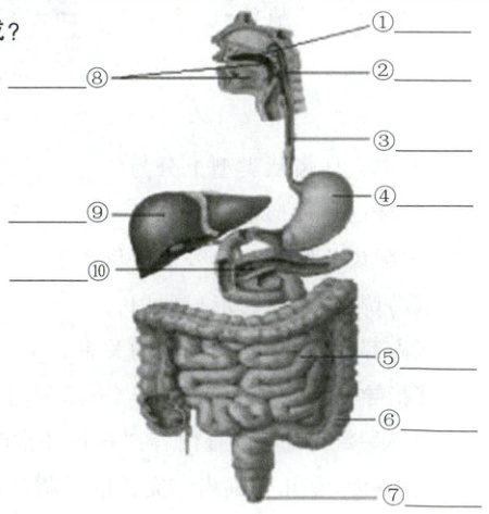 (1)①口腔 ②咽 ③食道 ④胃 ⑤小肠 ⑥大肠 ⑦肛门 ⑧唾液腺 ⑨肝脏 ⑩胰腺