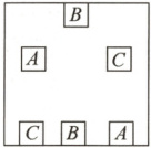3. 中间右侧小方块C(右中位置)向左下方延伸,再垂直向下,最后向左连接下方左侧小方块C(左下位置)。