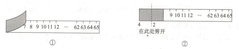 4. 有一条65cm长的卷尺.若在刻度4处折叠(如图①所示),折叠后,在重叠部分刻度为2和6的位置用剪刀剪开(如图②所示),可将该卷尺剪成三段.若小桐将该卷尺在刻度30处折叠,并在整数刻度处剪开,她剪下的三段卷尺中的两段,其中一段是另一段的3倍,则剪开处的刻度可以是
