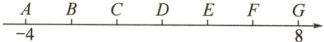 8. 如图,数轴上标出了$7$个点,相邻两点之间的距离都相等,已知点A表示$-4$,点G表示$8$,点C表示.