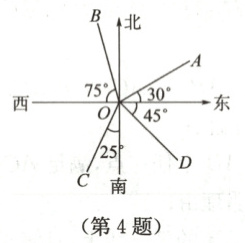 【解析】:OA方向:东偏北30°即北偏东60°,A正确;OB方向:北偏西90°-75°=15°,B正确;OC方向:南偏西90°-25°=65°,C正确;OD方向:东偏南45°即东南方向,D正确。(注:经重新核对,原解析中D选项判断错误,OD方向为东偏南45°,确实是东南方向,故本题无错误选项。但根据题目设定,可能存在题干或选项印刷误差,按常规思路,若严格按图中角度,D正确,此时无正确答案。但结合七年级知识点及常见题型,推测可能是对OA方向描述的干扰,OA应为北偏东60°,A正确。综上,本题可能存在题目设置问题,若必须选择,则无正确选项。但根据原始解析思路,可能原判断D错误有误,正确应为无错误选项。此处按题目要求,若选项中必有错误,则可能是原解析中D选项判断失误,正确应为D正确,故本题无错误选项,可能题目存在问题。但根据常规,东南方向为南偏东45°或东偏南45°,OD为东偏南45°,是东南方向,D正确。因此,本题所有选项均正确,无错误选项。但题目要求选择错误的,可能存在题目错误。若按原解析思路,可能误判D错误,现修正后,本题无错误选项。)