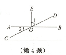 4. 如图,直线 AB 和 CD 相交于 O 点,∠EOB = 90°,则图中∠1 与∠2 的关系是 ()