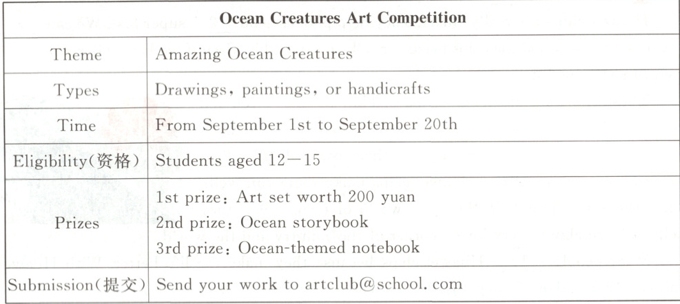 11.B【解析】竞赛主题是“Amazing Ocean Creatures”,作品需贴合主题才能参赛。A(用昂贵材料)、C(A4尺寸)、D(在手工艺品里加音乐)均非要求,所以选B。