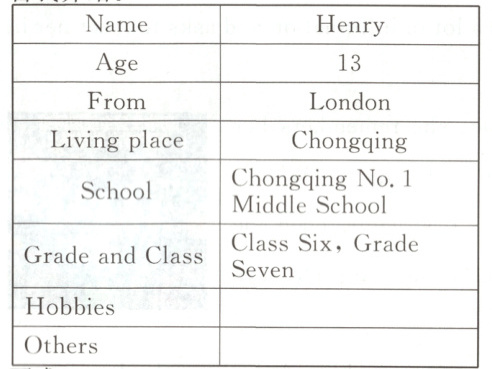 Hello, everyone! My name is Henry. I'm a thirteen-year-old boy. I come from London. Now I live in Chongqing because both my parents work in Chongqing. I study at Chongqing No. 1 Middle School. I'm in Class Six, Grade Seven.