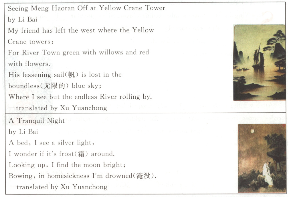 )13. What can we feel from the second poem?A. Li Bai's love for his friends.