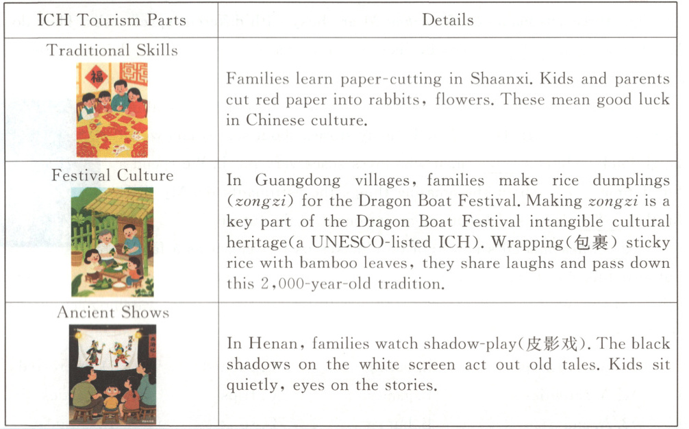 13.B 【解析】表格呈现了家庭在非遗旅游中“学剪纸(doing)、包粽子(doing)、看皮影戏(watching)”等内容,都是学习文化的方式。A(只看表演不做别的)与表格中“学技能、包粽子”矛盾;C(孩子只玩耍)错,原文“Kids and parents cut red paper in to...”及“Kids sit quietly,eyes on the stories.”说明孩子也参与学习;D(主要买礼物)表格未提及,需整合三项活动概括出“通过做和看学习文化”,选B。