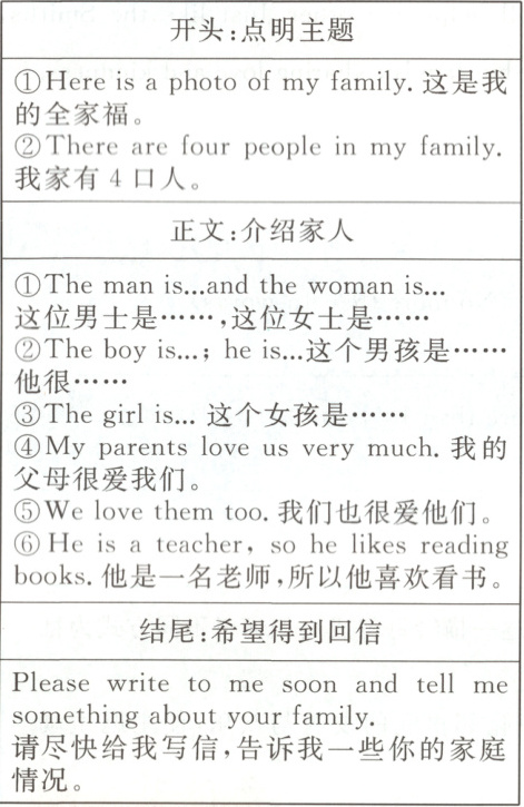 Here is a photo of my family. There are four people in my family. The man is my father and the woman is my mother. My father is a teacher and he likes reading. The boy is my brother, Tom; he is very active. The girl is me. My parents love us very much and we love them too. Please write to me soon and tell me something about your family.