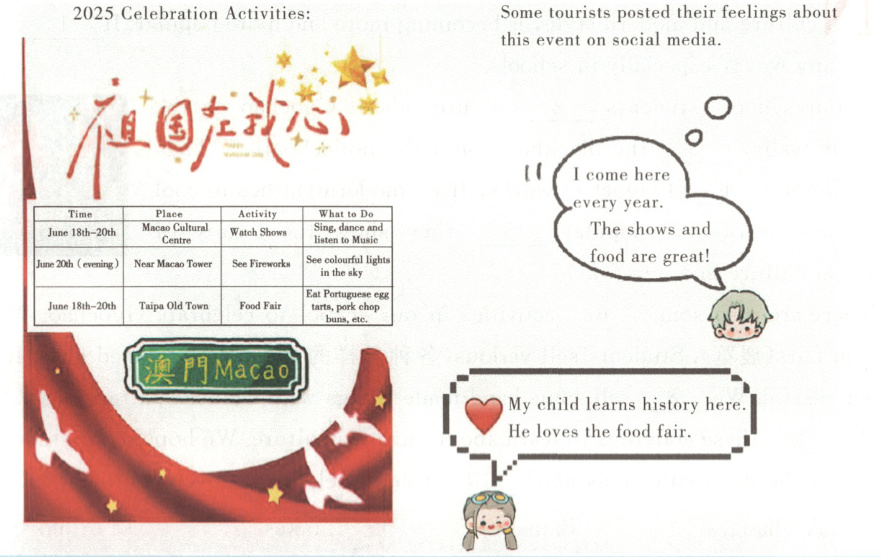 主题:人与社会·澳门回归庆祝活动 体裁:应用文 词数:110 难度:★★★☆ 建议用时:5 mins