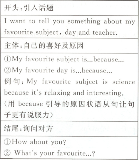 I want to tell you something about my favourite subject, day and teacher. My favourite subject is English because it's fun and I can learn many new words. My favourite day is Wednesday because I have English and P.E. that day. Mr. Wang is my favourite teacher because he always tells interesting stories in class. He often plays games with us after school. We all think he is a good teacher.