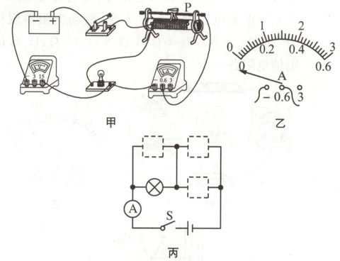 (4) 小红认为有更精确的测量方案,她初步设计了图丙所示的电路,请从滑动变阻器(0~20 Ω)、电阻箱(最低倍率是“×1”,元件符号)、电压表(0~3 V)中选择两个器材,并将它们的电路元件符号填入图丙合适的虚线框中,帮助小红完成电路设计.