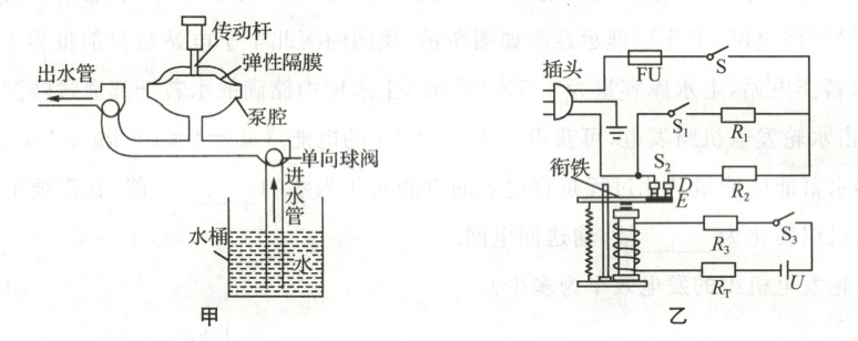 30 (7分)某型号的茶吧机具有自动取水和加热、保温的功能.取水时采用的电泵的工作原理如图甲所示,通电后电动机带动传动杆快速向下压缩弹性隔膜,进水管管口处的单向球阀关闭,出水管管口处的单向球阀打开,泵腔内大部分空气被排出;接着,传动杆快速向上拉动弹性隔膜,泵腔体积迅速增大,出水管管口处单向球阀关闭,水从进水管管口冲开单向球阀,进入泵腔.水腔内水面上方与外界大气相通.图乙是其加热、保温电路的原理图,$FU$为热熔断器(阻值忽略不计),$R_1、R_2$为加热电阻,$R_2=242\ \Omega$.开关$\mathrm{S}_1$闭合后,当水温升高到$100\ ^{\circ}\mathrm{C}$时会自动断开,断开后若无外力不会自动闭合.开关$\mathrm{S}_2$由电磁继电器控制,开始时处于闭合状态,水温升高至$89\ ^{\circ}\mathrm{C}$时自动断开,温度下降至$84\ ^{\circ}\mathrm{C}$时自动闭合.$U=9\ \mathrm{V}$,$R_3$是定值电阻.$R_T$是热敏电阻,其阻值随温度的升高而减小,其温度与水温相同,当温度为$84\ ^{\circ}\mathrm{C}$时,$R_T$的阻值为$300\ \Omega$;当温度为$89\ ^{\circ}\mathrm{C}$时,$R_T$的阻值为$240\ \Omega$.电磁铁线圈电阻忽略不计,当线圈中的电流达到$0.03\ \mathrm{A}$时,衔铁被吸下,触点$D、E$分开;当线圈中的电流减小到一定值时,衔铁被释放,触点$D、E$重新接触.现将插头插入$220\ \mathrm{V}$的插座中,向茶吧机的水壶内注入$1\ \mathrm{kg}$的水,水温为$24\ ^{\circ}\mathrm{C}$.闭合开关$\mathrm{S}、\mathrm{S}_1、\mathrm{S}_2、\mathrm{S}_3$,$R_1、R_2$正常工作,茶吧机开始加热,$155\ s$后水温到达$100\ ^{\circ}\mathrm{C}$,一段时间后进入保温工作状态.$[c_{水}=4.2 × 10^{3}\ \mathrm{J/(kg · ^{\circ}C)}]$