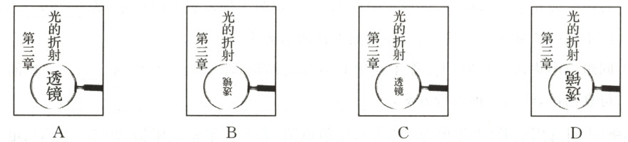 6C A选项中文字成正立、放大的像,用的是凸透镜;B选项中文字成倒立、缩小的像,用的是凸透镜;C 选项中文字成正立、缩小的像,用的是凹透镜;D选项中文字成倒立、放大的像,用的是凸透镜.故选C.